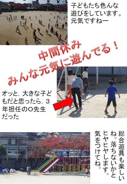 一番下の写真は,10時37分30秒の運動場の様子。子どもたちが運動場のあちらこちらで元気に遊んでいます。正確には,大人も一人遊んでいます。ワーワー叫びながら,とても楽しそうですよ。
