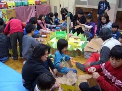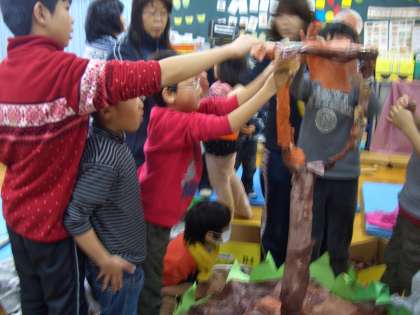 伏見南浜小学校で,下鳥羽小学校と伏見住吉小学校と伏見板橋小学校の育成学級の子どもたちが集まって,小さな巨匠展の合同制作をしました。それぞれが作った作品を飾る一本の木を,みんなで手分けをして作りました。枝になる芯に新聞紙を貼りつけ,その上から茶色に塗った紙を貼り枝を作ったり,木の根のところに新聞紙を詰めて茶色の紙を貼ったりしました。みんな一所懸命作ったので,すてきな木が出来上がりました。