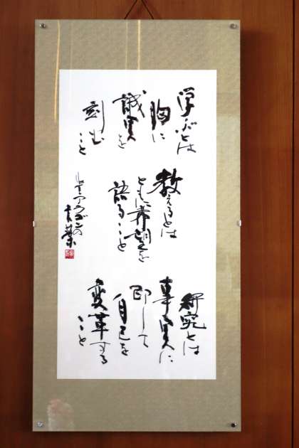 村岡先生には,大変お忙しい中,書いて頂きました。書道家として,学校関係者の中では有名な方です。活字で飾られたいたものと比較にならない位,重厚感にあふれ,名言がひときわ輝いて見えます。