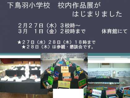 2月27日(水)より,H24年度の校内作品展が下鳥羽小学校体育館で開かれています。子どもたちの思いのこもった作品をご覧ください。