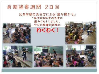 朝読書の時間に兄弟学級(2学年縦割りグループ)の先生方による