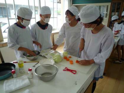 家庭科『見直そう食事と生活のリズム』の学習で調理実習を行いました。「朝食の大切さを理解し,朝食を工夫しよう。いためる調理の特徴を理解し,おいしくつくろう」のめあてのもとに,野菜いため・いり卵を作りました。班で協力しながら,手際よく調理を進めることができました。
