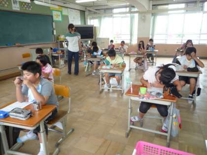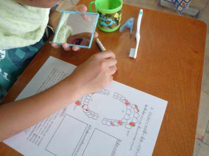 6日(木)に,プラークテストを行いました。自分の歯を観察した後,テスター錠で染め出しを行いました。赤く染まったところが磨き残しているところなので,確認して歯みがきをていねいにしました。また,「歯肉炎」についても学びました。