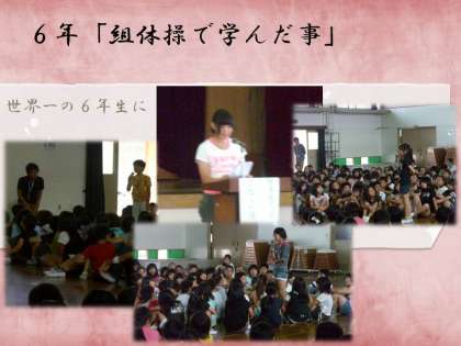 6年生は「組体操で学んだ事」という題名です。その中で「仲間」という言葉が何度もでてきていました。仲間の一人一人がつながり,輝いていく。それが見ている人への感動になることを,組体操に取組んで知ることができました。4年生や5年生から,今の6年生が頑張っている姿をいくつも言ってもらいましたが,まだまだやるべきことがあるようです。発表者は,最後にひとこと,もっともっと仲間を大切にしていく,世界一の6年生になると決意を述べました。