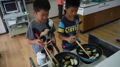 フライパンでやさいをいためます。