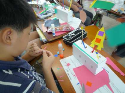 図画工作で『どんな動きをするのかな』の学習をしています。「動く仕組みを使って楽しい作品をつくろう」のめあてのもとに,クランクとカムの仕組みを使って作品を作っています。アイデアあふれる作品が出来上がるのが楽しみです。