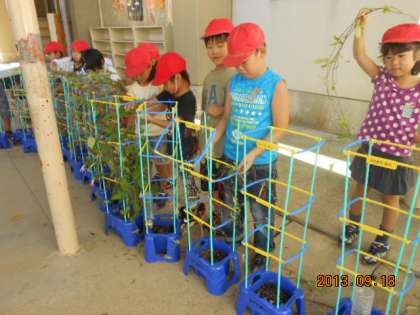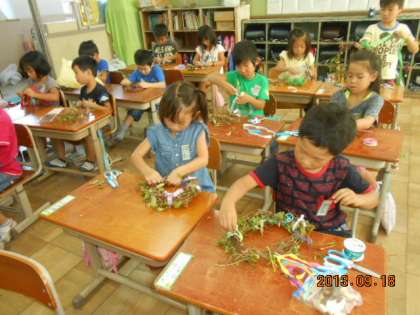 あさがおのつるを使って,丸く束ね,あさがおリースを作りました。