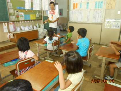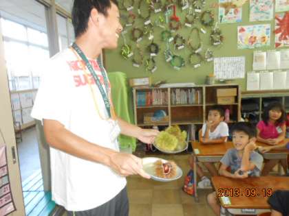 山より秋の知らせが届きました。いがの中に大きな栗が入っているのを見せてもらいました。「どこで栗をとりましたか。」「いがいがを触ると痛いですか。」と,さまざまな質問をしていました。