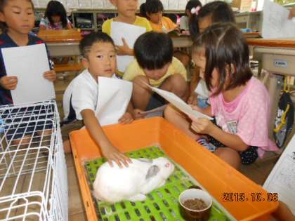 ウサギのお世話を始めたり,生活科の学習で「いきもの だいすき」の学習をしたりして,小動物の接し方を学んでいる子どもたちです。