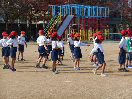 縄跳びあそびや鉄棒あそびを取り組んでいます。子どもたちは,縄を上手に回して前跳びや後ろ跳びをしています。