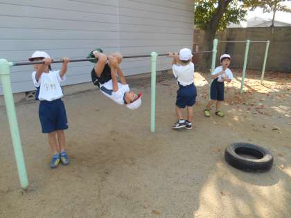鉄棒では,「布団干し」や「こうもりふり」などをしています。鉄棒の握り方に気をつけながら今後も取り組んでいきたいと思います。