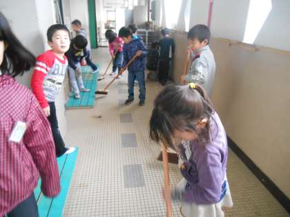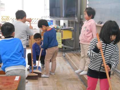 掃除時間の様子です。掃除の仕方はクラスごとに違いますが,それぞれが一人一役を任され,机を運んだり,ほうきで掃き掃除をしたりしています。