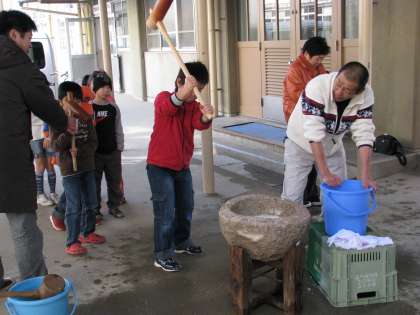 「新年明けましておめでとうございます。」元気な挨拶で始まりました。学校の体育館前で大人も子どもも餅をつき,体育館の中で,みんなでつきたてのお餅をおいしくいただきました。きなこ餅・大福餅・おろし餅,そして豚汁も・・・みんなおなか一杯。