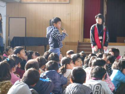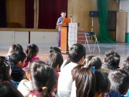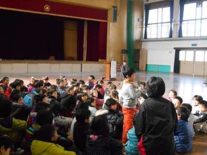冬休みに取り組んだお手伝いについての内容でした。1年生の子どもたちは,自分の大作戦と比べながらお話を聞いていました。