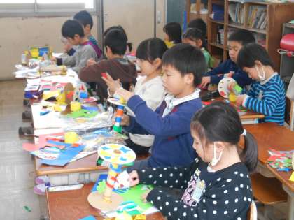 作品を取り掛かっている子どもたちの様子から,1年間の成長をまた,見つけました。それは,はさみを上手に使えるようになったこと,糊の加減を考えて糊づけをしたり,自分の思い描いたように飾りを作っていくことです。どのクラスの子どもたちも,上手になったなと感じました。