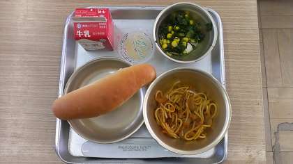 メニューは,「スパゲティのミートソース煮」,「ほうれんそうのソティ」,「小型コッペパン」,「牛乳」,「リンゴゼリー」です。