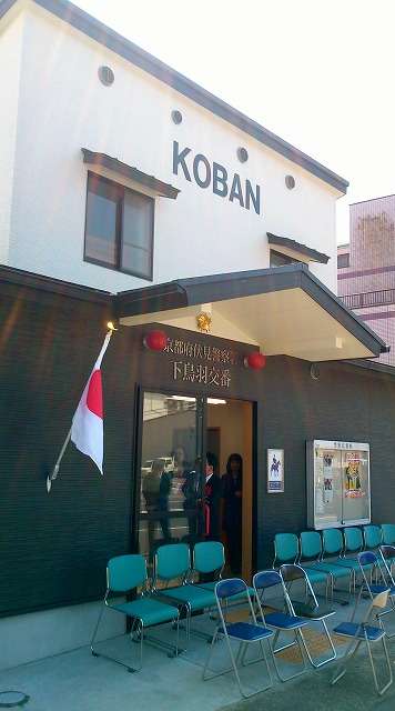 昨日,下鳥羽交番の落成式に出席してきました。下鳥羽交番が新築になったのです。式は,下鳥羽ふれあいセンターで行われました。式の後,交番の見学に寄せていただきました。たくさんの警察官の方々のお出迎えがあり,理由もなくドキドキ,オドオドしていたのですが,建物を見ると明るい色彩の建物でとても親しみやすい交番となっていましたので,ほっとしました。