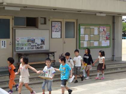 前回のなかよし集会で顔合わせしたグループで学校を回り,