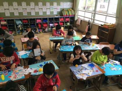 自分たちで紙に模様を描き,その紙をお店屋さんになって友だちと交換をしました。