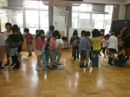 ひまわり学級の友達と島わたりゲームをしました。いっしょに歌を歌い合ったり,新しい歌を教えてもらったり・・・