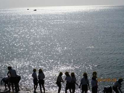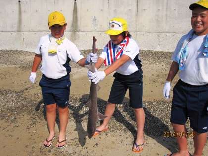 大漁だった地引網体験。生きた魚を触ったことがない子もいるようで,けったいな持ち方をして魚たちは跳ねまくり。持ち方を教えてもらって,はいポーズ。大きなタイです。サメもこうしてみると,可愛いものです。子どもたちにいじられまくって,クタクタになっているサメを見ると,多少かわいそうな気もしました。海の命をいただいて,私たちは生きています。感謝です。