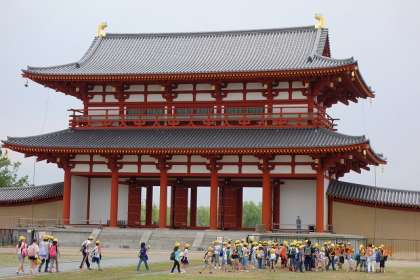 法隆寺を後にして,今度は平城京跡へと向かいました。時間が大幅に遅れているので,昼食の時間を短縮し,朱雀門あたりでさっそうお弁当タイムです。はるか向こうに,大極殿が見えます。見えますが,急いでいるので,そこは行きません。工事をしているようで,見学も難しかったかもしれません。風が強いので,朱雀門の風鐸が時折音をたてます。平城京ができた当時も,こんな音が聞こえていたに違いありません。