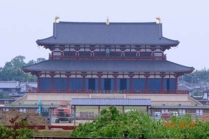 写真上から,朱雀門(京都の平安京にもありました。朱雀という地名や道路の名前が共通していますね),真ん中が遠くにかすんで見える大極殿(平安神宮の本殿を思いうけべていただければいいと思います),そして一番下が,朱雀門から南を見渡した光景です。朱雀門からの広場に見えるような空間は,実は大路です。この広さの道が,南の方へずっと続いていたのです。全国津々浦々まで,ほぼ直線に近い道がありました。地方へ続くその道幅も20m以上あったようです。今でいう高速道路ですね。この道幅を考えるだけで,えらく感動するものです。すごい技術と労働だったろうなと思うわけです。