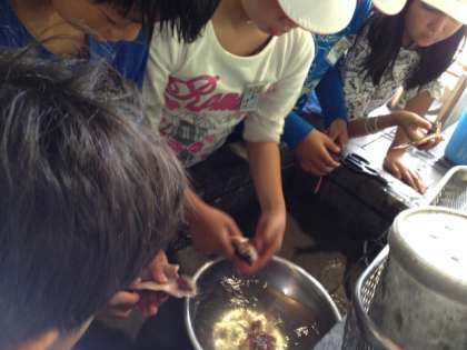 先ほどの魚をさばきます。山の家の所員の方に教わっています。うまくできるでしょうか。