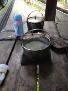 ごはんがおいしそうに炊けました。豚汁もおいしそうです。自分たちで協力して作ったものをいただきます。