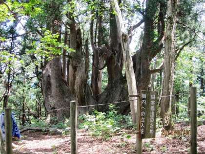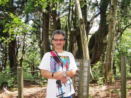 井ノ口山に登ることになったのは,そもそもは私の意見です。この杉を見たかったのです。樹齢700〜800年と言われる「伏状大杉(ふくじょうだいすぎ)」です。天然記念物に指定されている貴重な樹木です。何本も木が生えているように見えますが,一本の幹から枝分かれして生えているのです。思わず見入っている,A先生とO先生。この真剣なまなざしが,すごさを物語っているようです。満面の笑みを浮かべて,私も写真を撮ってもらいました。しんどいのに,何故か笑顔になっていまします。