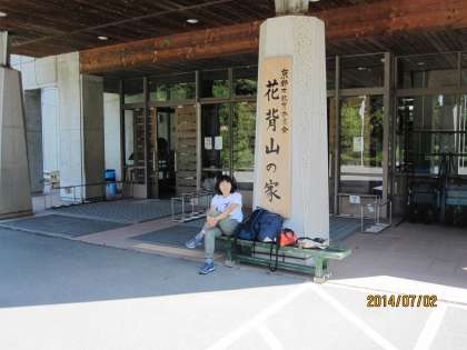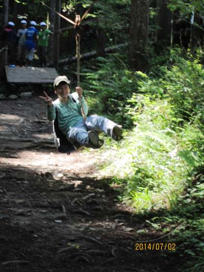一番右の写真は,花背山の家とそのマスコットガールの写真ではありません。アスレチックの時間の,本部の様子です。Y先生は,休憩しているのではなく,本部で待機しているのです。Y先生は,山登りの後に山の家に参加したので,元気いっぱい。