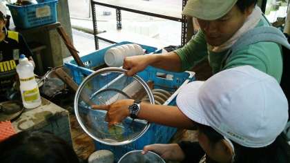 先ほどの鍋磨きの続きです。子どもたちも必死に磨いています。なかなかとれない,スス汚れ。ついに,先生も出動。先生も磨く 磨く 磨く。Y先生も,必死になって磨いています。K先生は,ドヤ!という顔で,汚れを指摘しています。指摘するのはいいのですが,最終的にはK先生も磨き活動に参加することになりました。