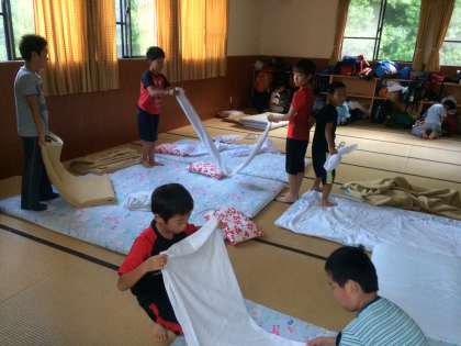 起床時刻より少し前に起き、二人で協力して布団やシーツをたたんでいます。