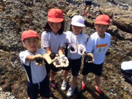 ウニ、ヒトデ、ヤドカリなどなど、たくさんの生き物をみつけたよ。もちろん、観察した後は海に返しました。