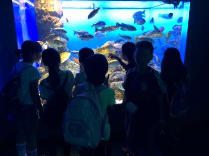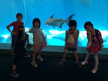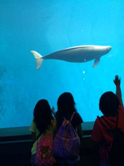たくさんの生き物に興奮しています。スナメリに手をふっています。