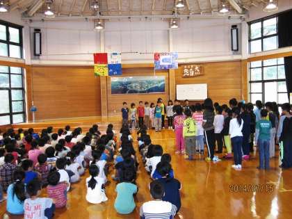 カニとたわむれた後は,朝の集いです。一緒に生活する桂川小学校の子どもたちと,お互いに学校紹介をします。どちらの子どもたちも,しっかりと話をすることができました。