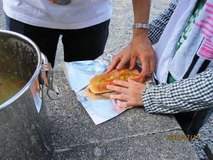 いよいよ朝食。ウ〜ン,最近見たような光景!。そうだ,山の家でもやったっけ,パックドッグ。山の家では,それぞれの子どもたちがキャベツをパンにはさんでいたのですが,ここではトングが2つしかなかったので,Y先生と私がキャベツをはさむ係をしました。子どもたちに,「はさむの上手ですね」とほめられ,ずいぶんやる気がでてきました。山の家でもほめてもらいましたが,子どもたちはほめ上手です。大人たちも,もっと子どもたちをほめましょう。