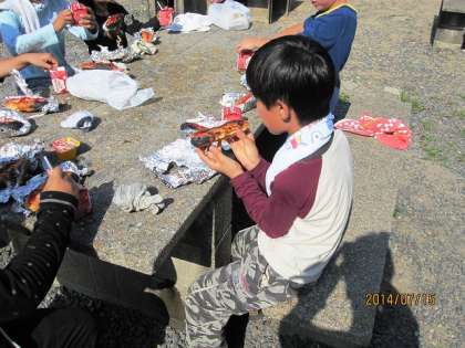 さて,野外で食事をするのですが,賢いカラスたちが狙っています。カラスにパンを持って行かれた子どももいました。その直後,トンビもやって来ました。低空を飛んで,パンを狙っています。驚いたことに,パンにはあまり興味がないらしく,奪ったパンから上手にソーセージだけを抜いて食べていました。パンを持って行かれたという憤りよりも,賢いなー と感心してしまいました。