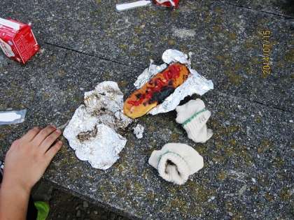 はい,できあがり。アツアツのホットドッグです。「こんなに焦げていていいのかしら」 とでも言いたげに,食べるまでに間がありました。こんなものなのですよ。焦げているところを,剥いて食べましょうね。