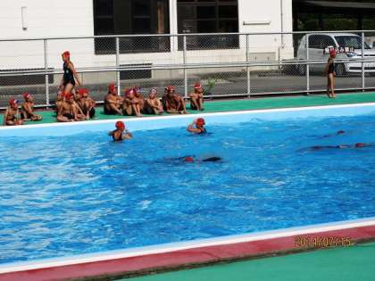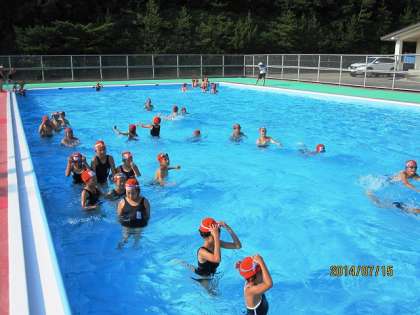 磯観察から戻ると,体についた塩を落とすためにプールに入ります。子どもたちはプールを楽しみにしていたようです。プールなら学校にもあるのにね。暑い中,プールの冷たい水が,さぞ気持ちよかろうと思って,「気持ちいいやろ」と聞きますと,「ぬるいお風呂みたいです」という返事。ちょっと子どもたちの予想を裏切ったぷーるでしたが,結構楽しそうにプール学習をしていました。