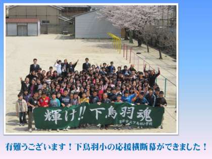 この応援横断幕は,今後,陸上・駅伝はもちろん,あらゆる部活動の試合の際にどんどん使いたいと考えています。下鳥羽小学校はますます頑張ります!