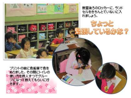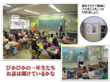 昨日入学式を迎えたばかりの新一年生は,今日一日をどのように過ごしたでしょうか。担任の先生と一緒に教室のきまりごとを一つ一つ確かめている姿は,もうすっかり小学生です。お話もしっかり聞けていましたよ。これなら勉強が始まっても大丈夫ですね。