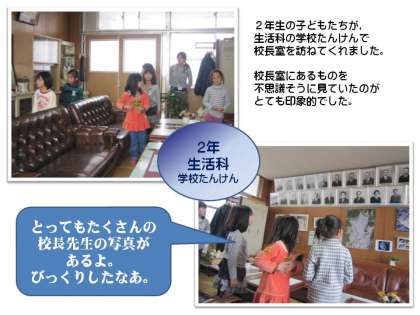 2年生の子どもたちが,生活科の学校たんけんで校長室にやってきました。1年生たちに,校長室がどんな部屋なのかを分かりやすく説明するのだそうです。一度目は,珍しそうに眺めるだけだった子どもたちですが,後からノートを持ってきて,一生懸命に記録していました。「どんなモノがあるのか。」「部屋にあるモノとモノに何か関係があるのか。」「誰が訪ねてくるのか。」「どんなお話をしているのか。」いろいろと疑問は尽きないようです。1年生にうまく伝えてあげてね。