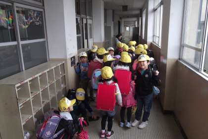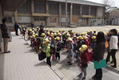 1年生は,学校に慣れるまでのしばらくの間,集団下校を行います。昨日の入学式を終えて,子ども達は今日から学習を始めています。教室での初めての学習で,少し疲れているかもしれませんが,児童館の先生にも迎えに来ていただいて,大きな声で「さようなら」を言って,元気に下校していきました。