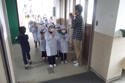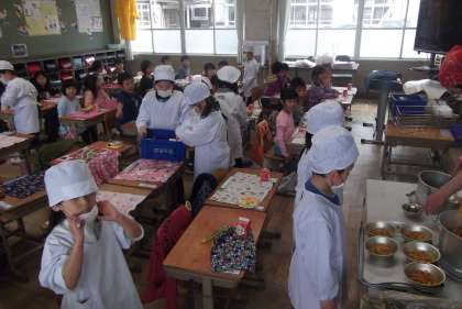 いよいよ待ちに待った給食が始まりました。エプロンの準備や給食台の準備など,給食当番で力を合わせて行いました。給食室での約束を知ったり,運び方を教えていただいたりしながら,用意ができました。
