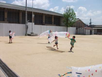 生活単元学習で,一人一人自分のこいのぼりを作りました。子どもたちは,アイデアいっぱい,カラフルなこいのぼりを持って運動場をかけまわり,こいのぼりが元気に泳ぎました。