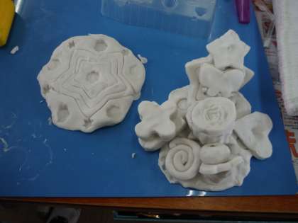持ち寄った材料を使い,ねんどにかたを付けたり,かた抜きをしたりしました。