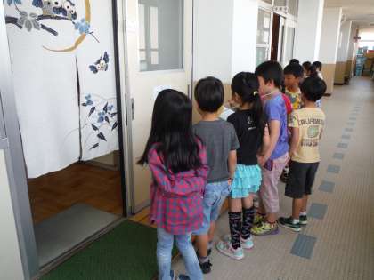しっかりと1年生の手を引いて,一生懸命に部屋の説明を頑張っていました。