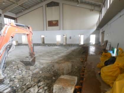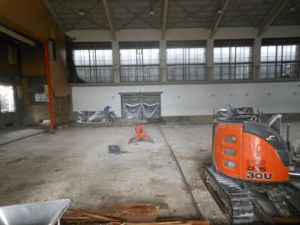 体育館の解体工事がすすんでいます。体育館の周りは防音シートに囲まれているため,中の様子は見ることができません。下校途中,工事車両出入口前から,子どもたちが中をのぞくようにしている姿を見かけます。工事のすすみ具合が気になるのでしょうね。それでは,ちょっと中をのぞいてみましょう。