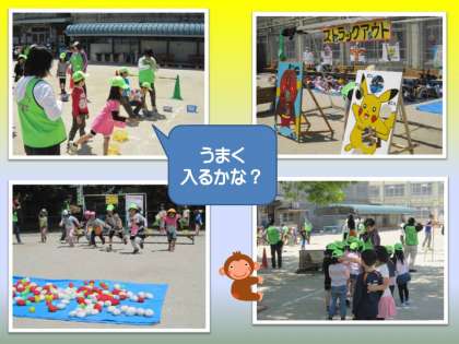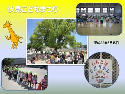 5月15日(土)竹田小学校において,『伏見こどもまつり』が行われました。下鳥羽児童館からも,たくさんのお友だちが参加していました。運動場や体育館では,さまざまに工夫されたコーナーが開かれており,みんなとても楽しそうでしたよ。首からぶら下げたカードに印をつけてもらいながら,元気いっぱい笑顔いっぱいで校内を回っていました。暑いくらいのいいお天気でしたね。